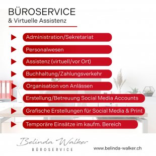 #Tags: Personalwesen, Personaladministration, Büro- und Sekretariatsarbeiten, Neuorganisation, Reorganisation, Unterstützung bei Firmengründungen, Zahlungsverkehr, Projektmanagement, Qualitätsmanagement und Zertifizierungsbegleitung, Social Media Erstellung/Betreuung/Unterhalt, Website Betreuung/Unterhalt